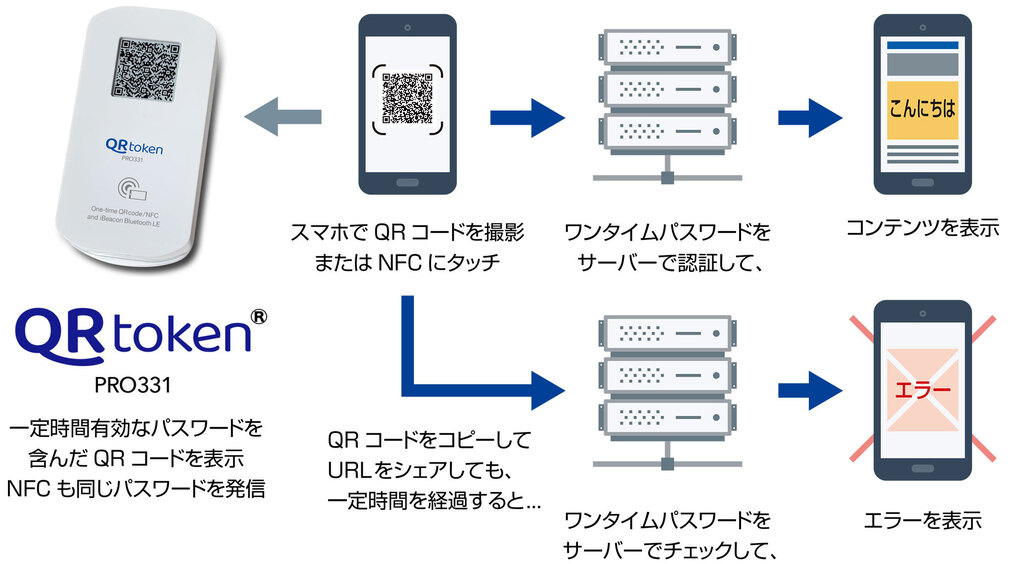 ユーザーのスマホでQRtoken®端末のQRコードを撮影すると、瞬時にサーバーにアクセスして認証を行ってコンテンツを表示します。コピーしたQRや一定時間を経過すると、サーバーの認証が得られず、エラーを表示する仕組みです。